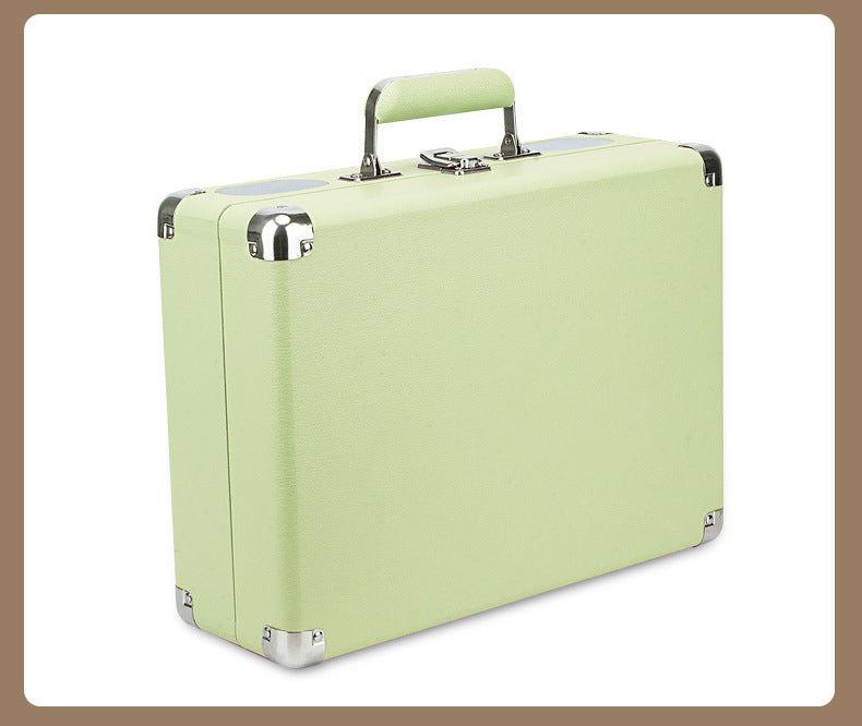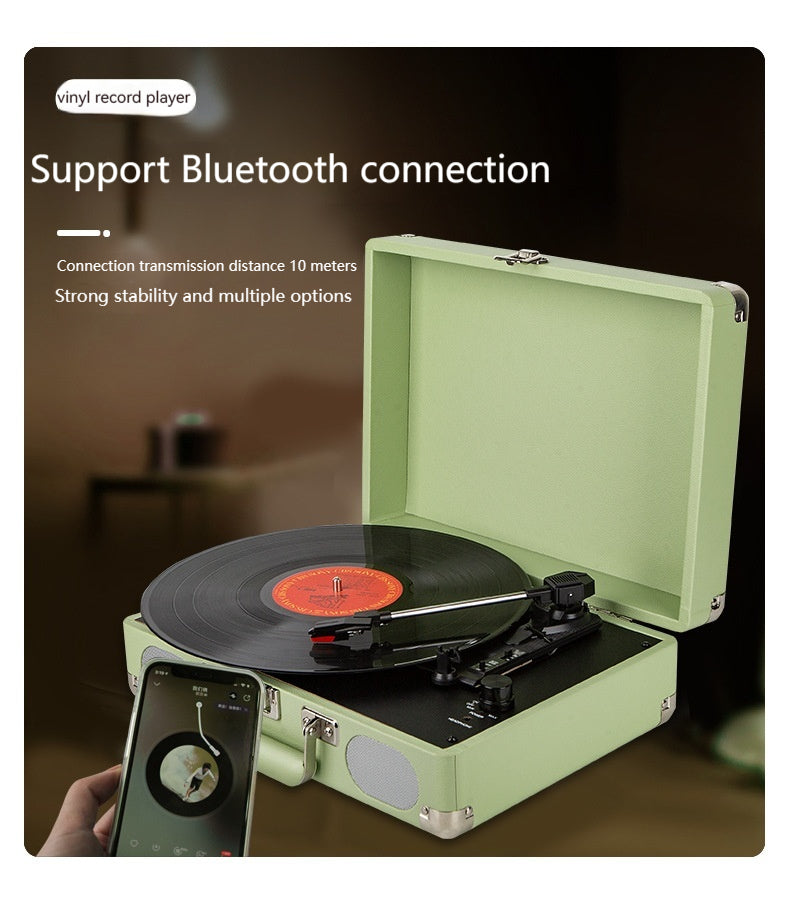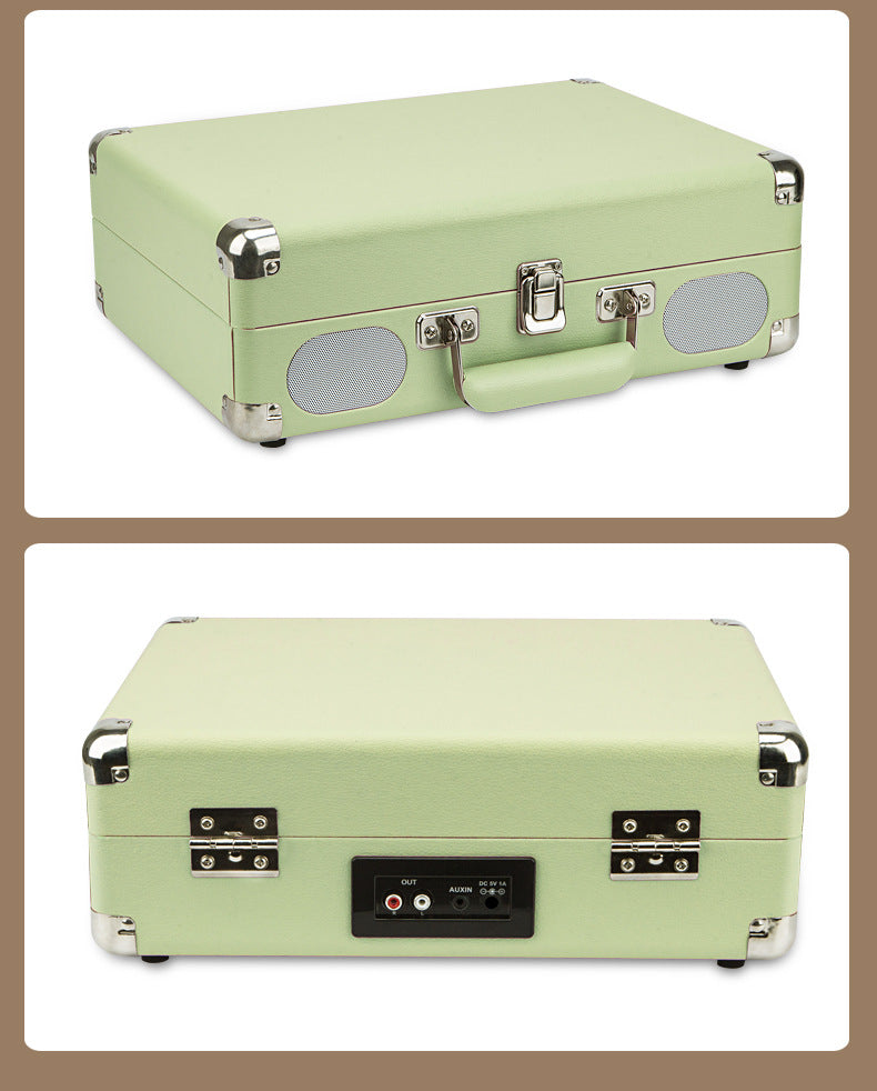Bluetooth Old-fashioned Portable Phonographs revive vinyl nostalgia in a mint green suitcase design with built-in stereo speakers, 3-speed belt-drive turntable (33/45/78 RPM), and Bluetooth for wireless streaming from modern devices. The sturdy handle enables easy portability while ruby stylus and auto-stop protect records during playback, with AUX/RCA outputs for external amplification and USB for digitizing tracks. Battery-powered for 4-8 hours of use, it delivers warm analog sound suitable for casual listening, though built-in speakers prioritize convenience over audiophile fidelity.