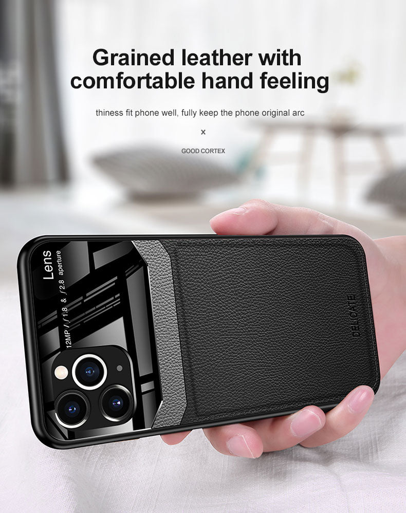 Business litchi phone case crafted from selected leather with a refined litchi‑grain texture, combining a glossy upper section around the camera with a grippy, anti‑fingerprint lower panel for everyday protection. The slim, elegant design comes in multiple classic colors such as red, black, blue, and brown, making it a stylish choice for office, meetings, or any professional setting.