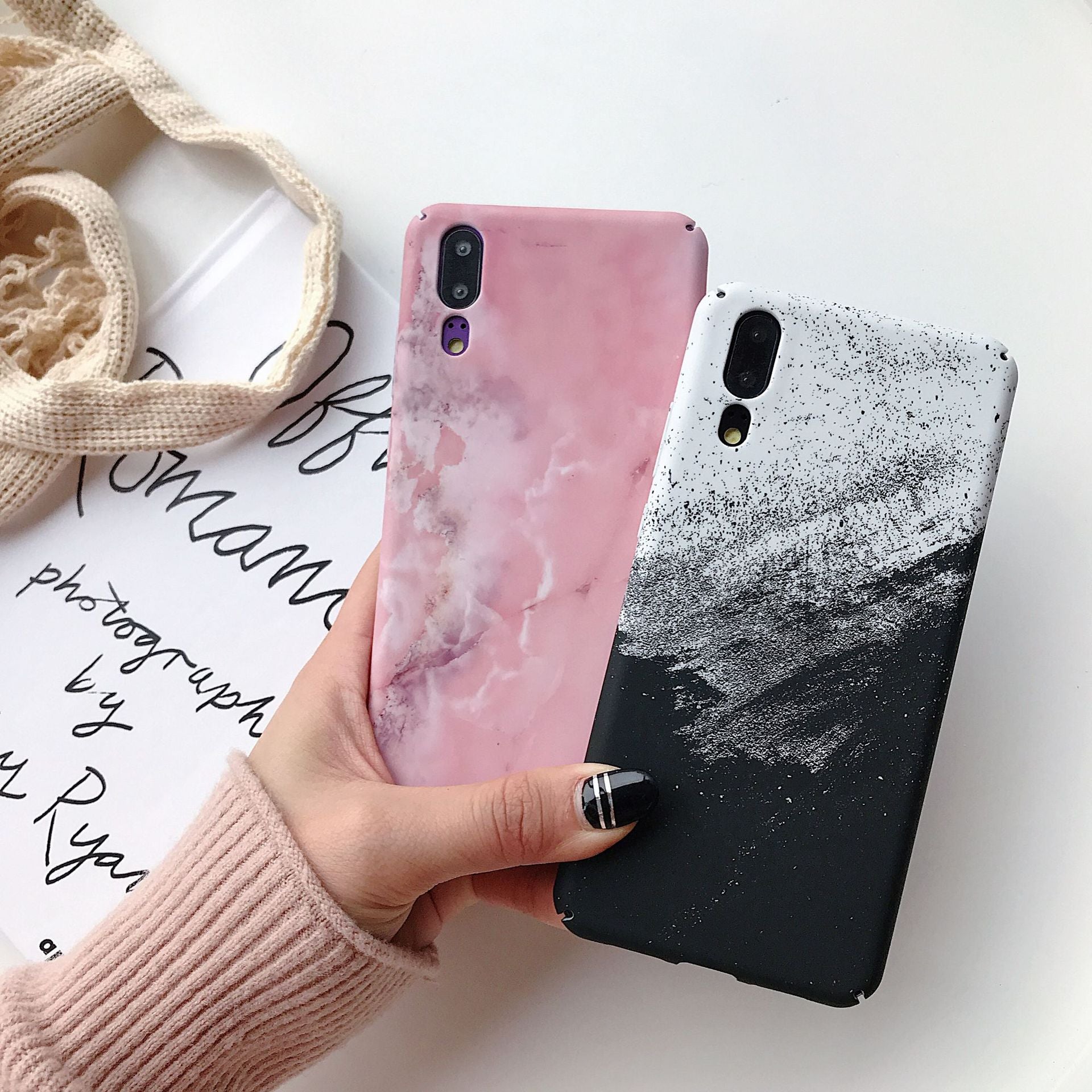 Painted phone case featuring soft matte finishes with artistic designs, including a pink watercolor‑style marble pattern and a black‑and‑white splash effect for a minimalist yet expressive look. The slim hard shell wraps closely around the back and sides of the phone to guard against everyday scratches and light bumps while keeping all ports, buttons, and the camera unobstructed.