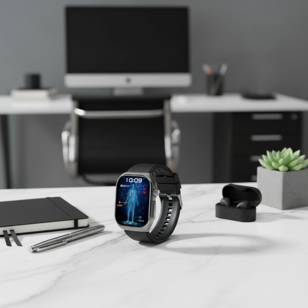 Track your health and stay connected with this advanced smartwatch featuring ECG monitoring, Bluetooth calling, and comprehensive wellness tracking. The durable aluminum alloy case pairs with your choice of silicone or nylon wristbands in multiple colors for personalized style. Monitor heart rate, blood pressure, blood oxygen, and body temperature in real time, while enjoying waterproof design for all-day wear. Sleep tracking and smart reminders keep you informed, and Bluetooth calling lets you answer calls directly from your wrist. Whether you're focused on fitness or staying connected, this intelligent timepiece adapts to your lifestyle.