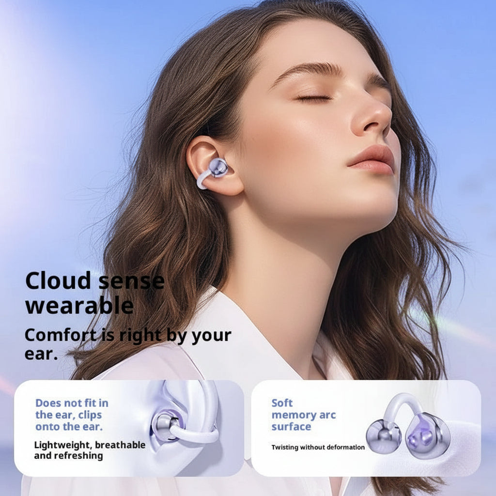 These sound ear clip wireless Bluetooth headphones feature a unique non-intrusive design that gently clips onto the ear instead of going into the ear canal, providing exceptional comfort even during long listening sessions. With panoramic surround sound, ultra-long battery life, and a stylish metallic finish that can double as fashionable earrings, they are perfect for users who want both audio quality and wearable elegance in one accessory.