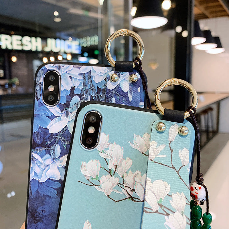 Wristband phone case featuring a soft floral back design with an integrated strap that snaps in place, allowing you to slide your hand through for a secure, anti‑drop grip while using your phone. The raised wristband also doubles as a convenient stand for watching videos or video‑calling hands‑free, combining style and everyday practicality in one slim case.